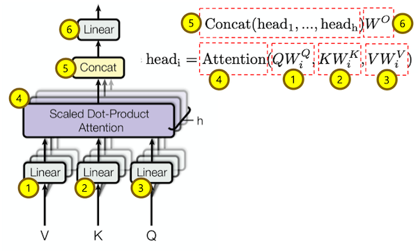 $$head_i = Attention(Q{W_i}^Q, K{W_i}^K, V{W_i}^V)$$