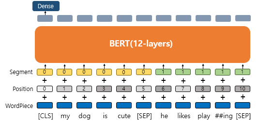 입력 텍스트가 여러 개이므로, 텍스트 사이에 [SEP] 토큰을 집어넣고, 두 종류의 세그먼트 임베딩(Sentence0, Sentence1)을 사용하여 Document를 구분한다.