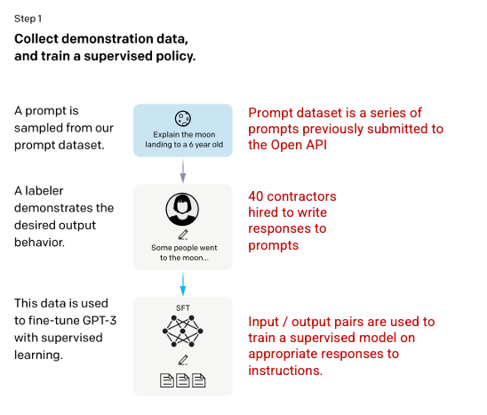 입력 prompt에서는 OpenAI API에 실제 사용자가 입력한 내용을 수집하였으며, 40명의 고용된 Labeler들은 해당 prompt의 답변을 직접 입력하여(다양한 경우에 대한) 각 입력에 대한 출력을 만들게 된다. 그리고 이를 통해 demonstration dataset을 생성한다.