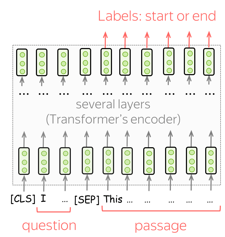 Passage의 각 토큰에 대해 최종 BERT 표현을 사용하여 이 토큰이 올바른 세그먼트의 시작인지 끝인지 예측한다.