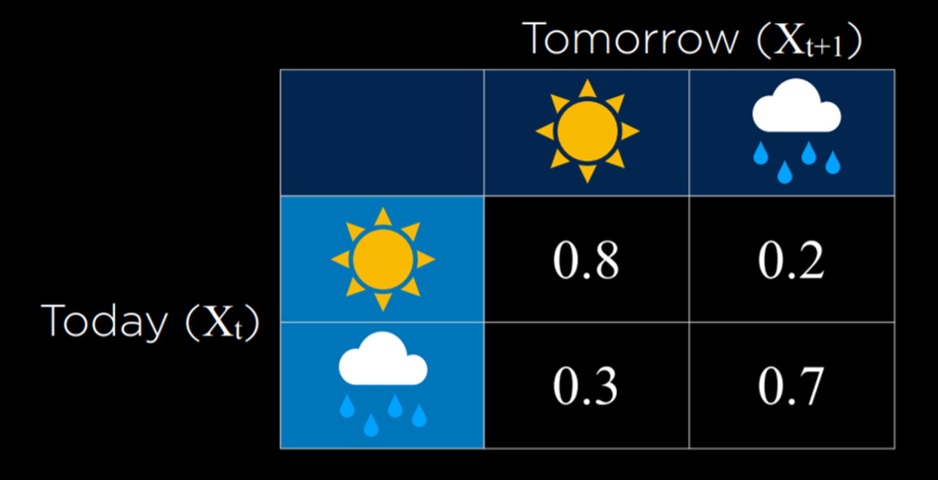 $X_t$ : Weather at time $t$ 와 같이 정의할 수 있을 것이다. ($X_0$ : 0일의 날씨)