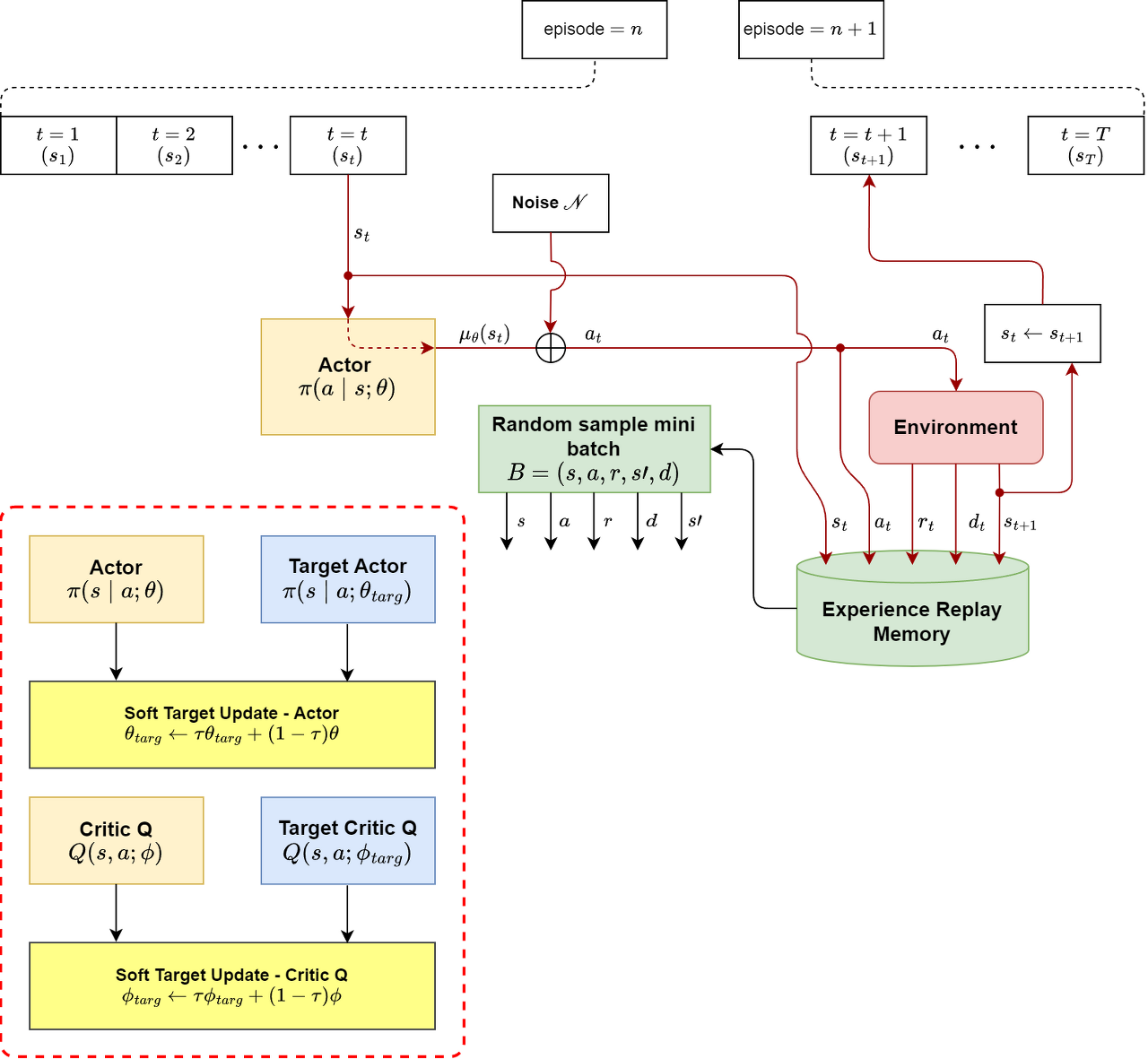 - actor network를 사용하여 행동 $a_t$를 결정하고, 탐색을 위한 $N_t$를 추가한다. $a_t = µ_{θ}(s_{t})+N_{t}$ 그리고 $(s_t, a_t, s_{t+1}, r_t)$를 버퍼(Buffer)에 저장한다.
