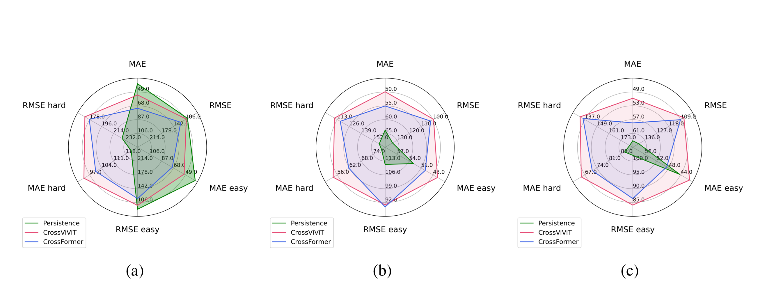 위 레이더 플롯은 CrossViViT 모델의 성능을 Persistence 모델 및 CrossFormer 모델과 비교한 결과를 나타낸다.