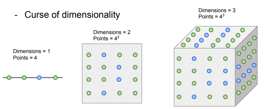 → 학습 데이터는 차원이 증가할 때마다 기하급수적으로 증가한다.