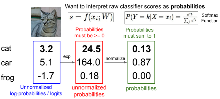 score vector는 변함이 없지만, 이 score를 각 class에 대하여 unnormalized log-probabilities로 해석하여,
