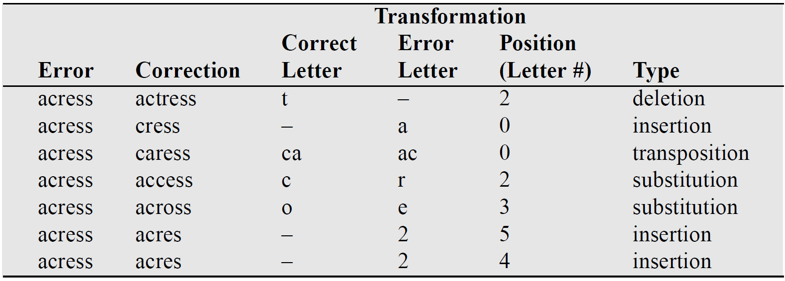 이에 따라, error 사이에 삽입, 삭제, 대체, 전치와 같은 단순한 변형만 존재한다고 가정하고
