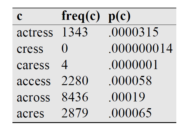 "acress"라는 word에 해당 가정과 Bayesian Rule을 적용하여 candidate correction table을 생성하면 다음과 같다.